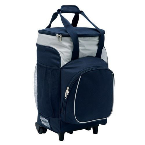 600D/420D polyester. Double zippered front storage pocket with lockable zips. Large elasticated top mesh side pockets. Double zippered top lid opens PVC lined main compartment. Webbing carry handles with Velcro cuff. Sturdy base with front feet to keep bag upright. Retractable trolley handle with plastic grip and release button. Dual wheels on base.