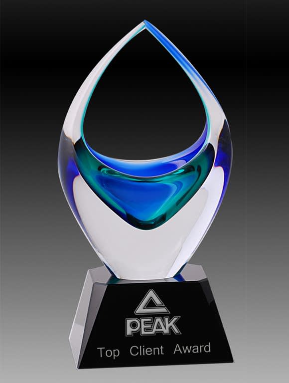 The Vase Blue/Green On Black Base comes in 1 size. The vase comes with a black crystal base which we attach a brushed silver printed plate. • Price Includes: Printed Metal Title Plate attached to Base • Add logo - no extra charge VARIATIONS: Due to the handmade nature of these pieces, some variations in design, size and colour can occur.