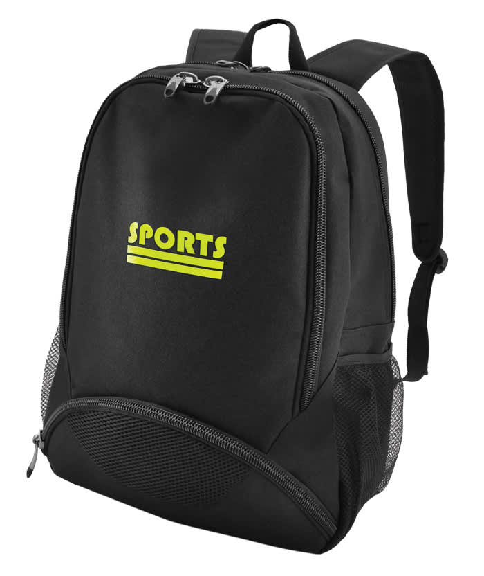 Zippered main compartment with inside open pocket, Front zippered pocket, Zippered wet pocket at bottom, Elasticised mesh pockets on both sides, Adjustable padded backpack strap