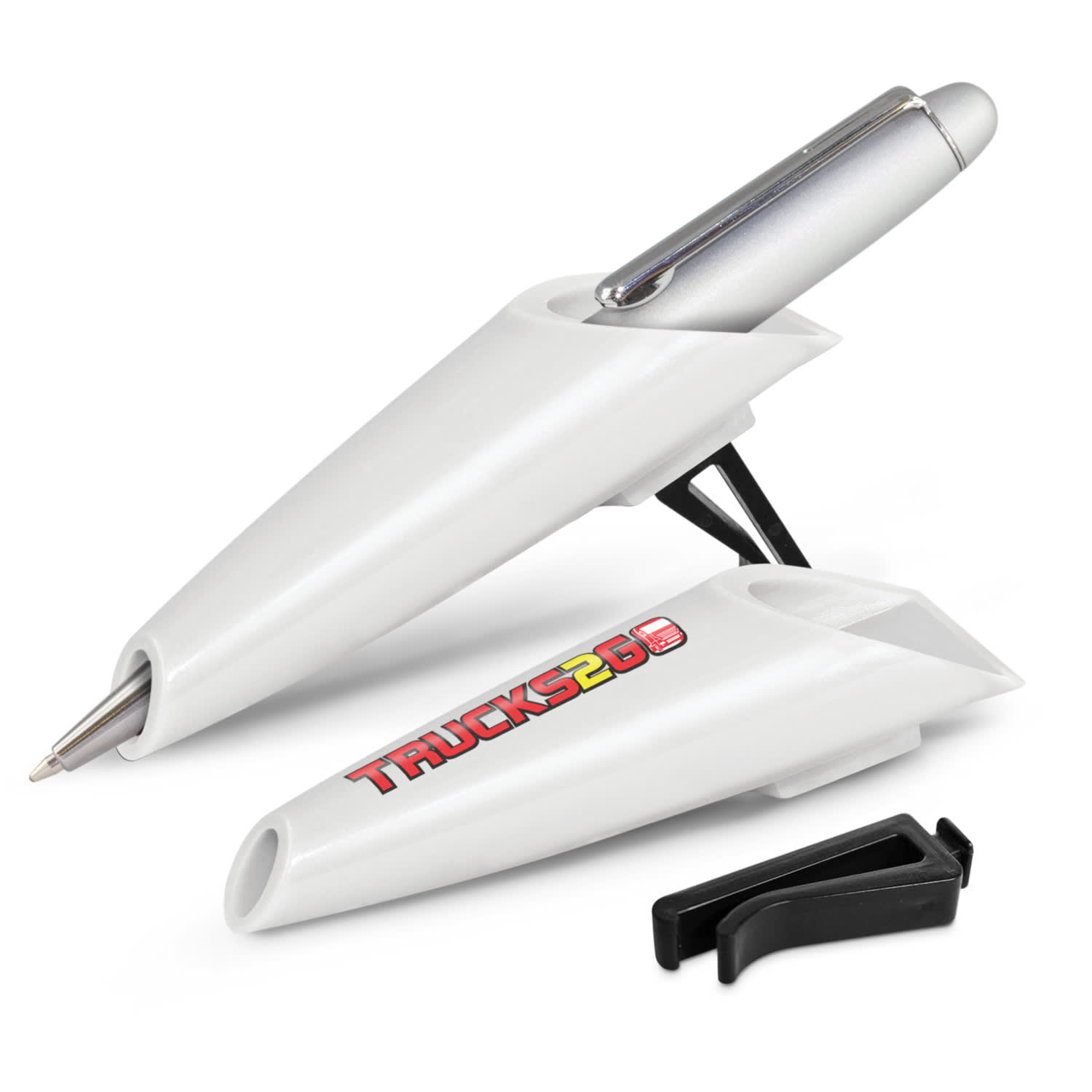 Pen holder which clips securely to car air vents. It has a removable clip which is supplied unassembled.
