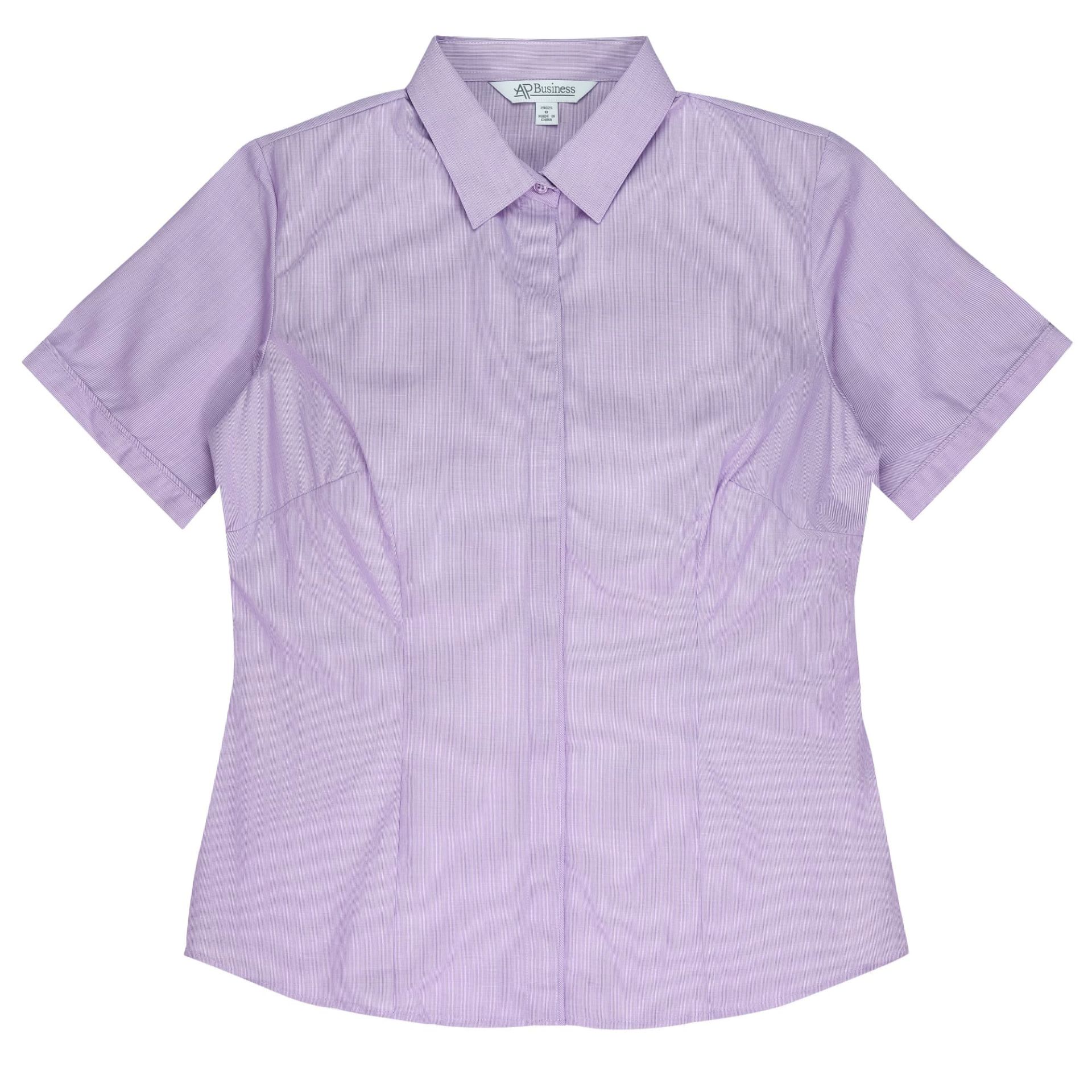 Style: 2902S Sizes: 4-26 Fabric: 65% Polyester 35% Cotton Features: Bust and waist darts front and back create a feminine fit There is a “chesterfield” front where the placket conceals buttons as well as a hidden Magic Button Bias piping has been added to the front placket edge and sleeve cuff seam A small buttoned finish on the short sleeve Anti-pilling treatment 3 Colours: Shadow Grey, Mauve, Mid Blue