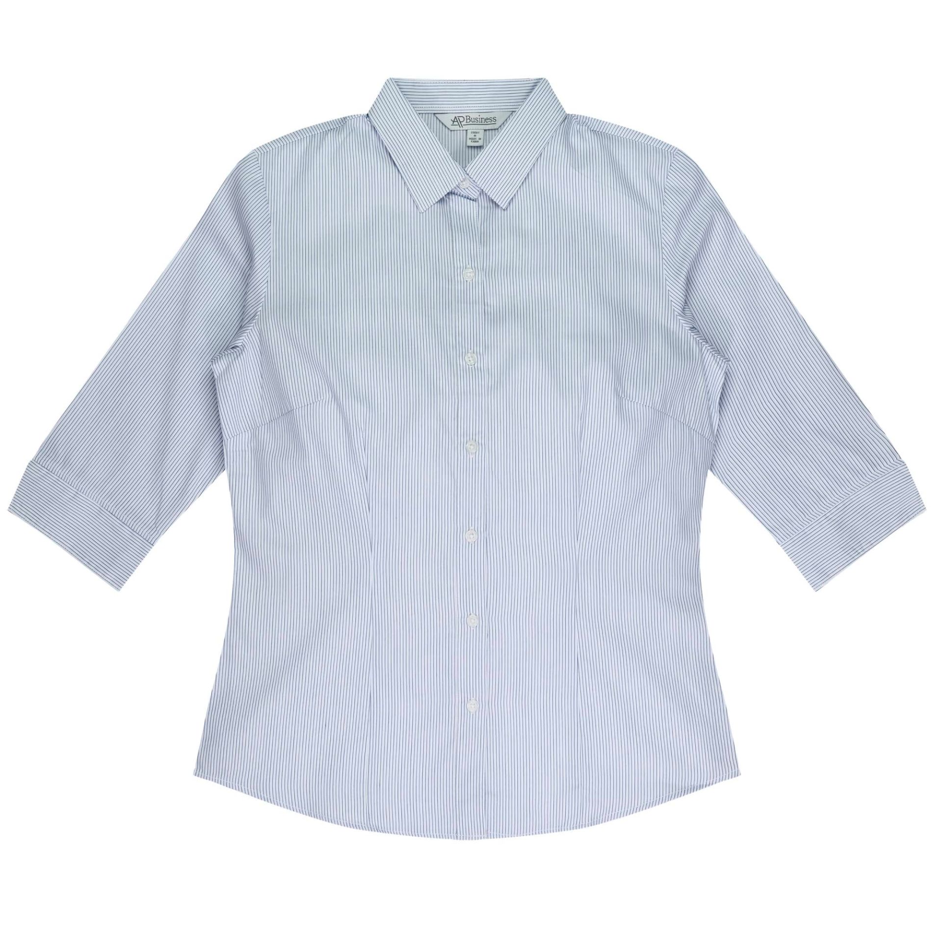 STYLE: 2900T Sizes: 4-26 Fabric: 65% Polyester 35% Cotton Features: A double turned Placket is edge stitched to match the Collar Stripes on the Sleeve cuff are cut on opposing directions to give a trendy contrast. Bust and waist darts create a slimline fit. Anti-pilling treatment 3 Colours: White/Navy, White/Purple, Black/Silver
