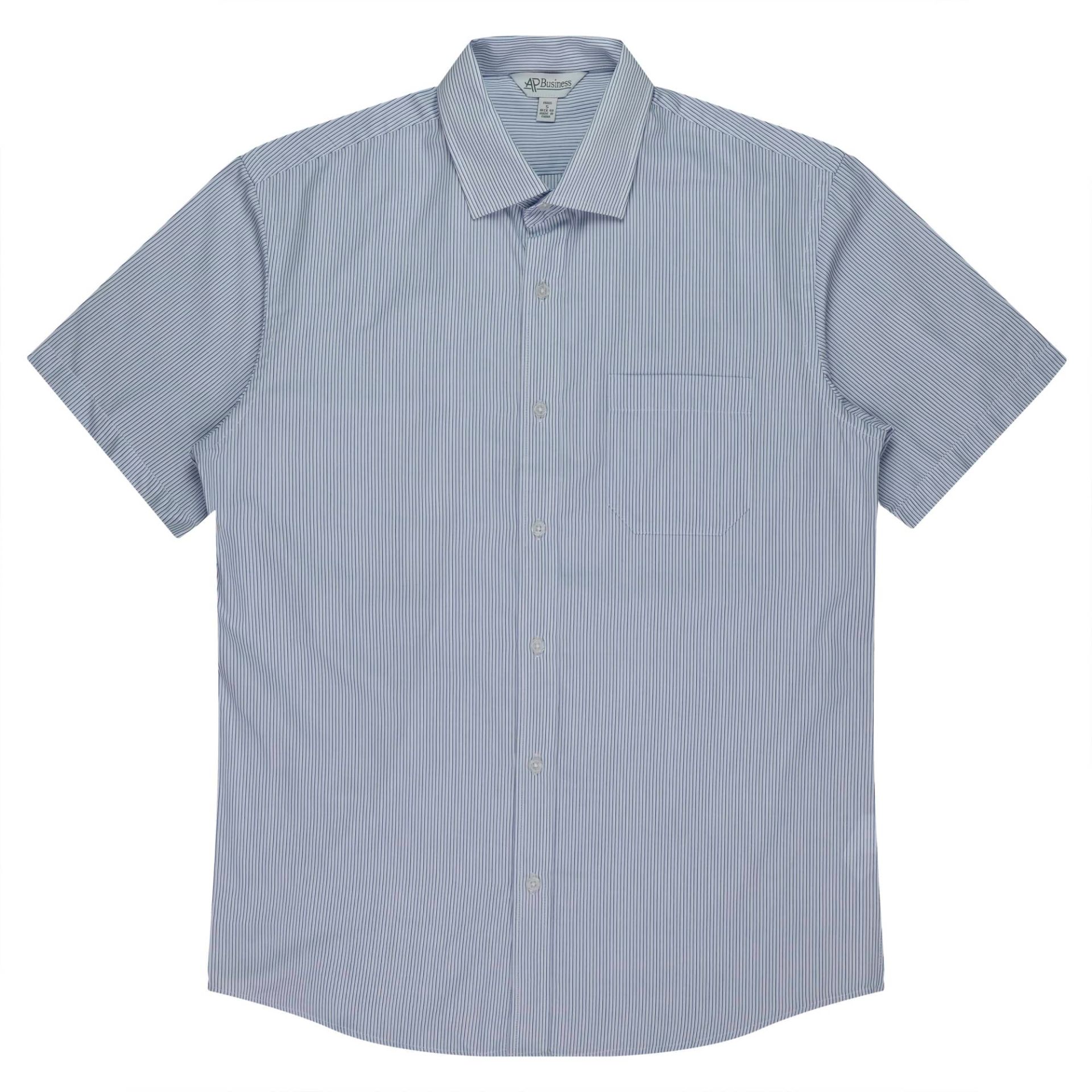 STYLE: 1900S Sizes: XXS-5XL Fabric: 65% Polyester 35% Cotton Features: A superbly crafted, striped shirt featuring a top stitched and pleated front placket. The collar is top stitched with a contrast directional cut cuff with an angled finish. Anti-pilling treatment. 3 Colours: White/Navy, White/Purple, Black/Silver.