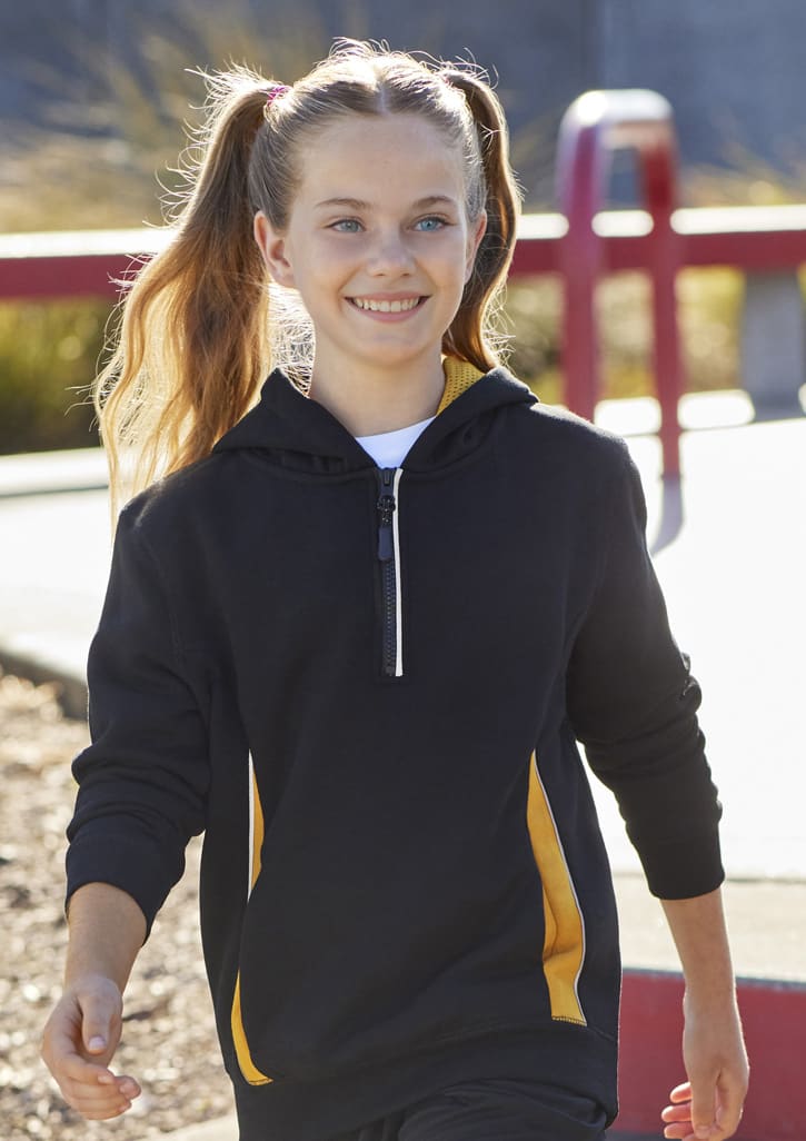 Features: Silver reflective trims help you stand out Modern ½ zip neck for easy on & off Hand warmer side pockets Soft ribbed hem & cuff for a comfortable fit Full mesh-lined hood Fabric: 55% Cotton / 45% Poly, 320gsm UPF rating - Excellent Sizes: 4 - 16