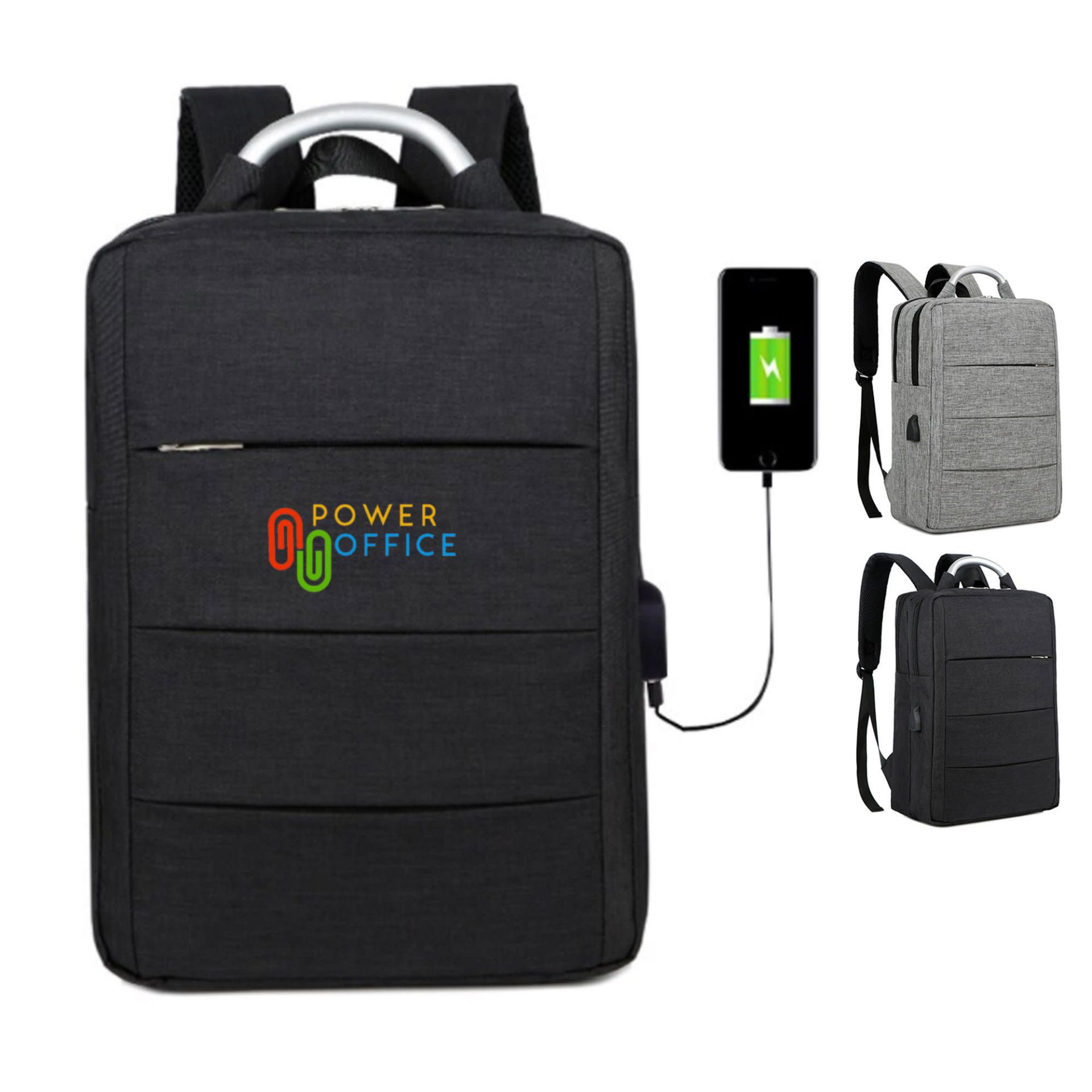 This modern stylish laptop backpack is made from high quality sponge nylon and has one front zipped pouch. The bag is combined with 2 complete independent front and back compartments front compartment has 2 small pouches and a pen holder the back compartment has a large pouch with black velcro closure strap for laptop and iPad this pouch is padded thicker to protect inside laptop and iPad. It also features USB charging port with a charging cord attached (inside power bank not included) and adjustable straps. Bag has a zip closure top for both compartments an aluminium handle in the middle is for you to carry the bag by hand.