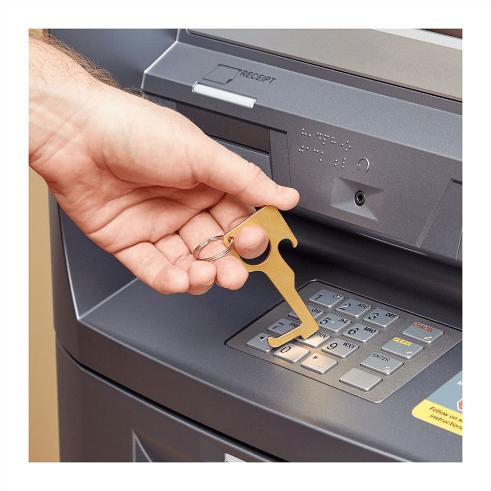 A must-have for everyone’s key ring is the No Contact Keychain. This keychain tool helps to avoid contact with dirty, contaminated surfaces. This multi-purpose tool can be used when opening doors, pressing buttons, using the ATM, and carrying shopping bags. Made from brass. Hook shape designed to grab a handle and open doors. The end can be used to push elevator buttons. Top side can be used as a bottle opener. Add this to your assortment of PPE.
