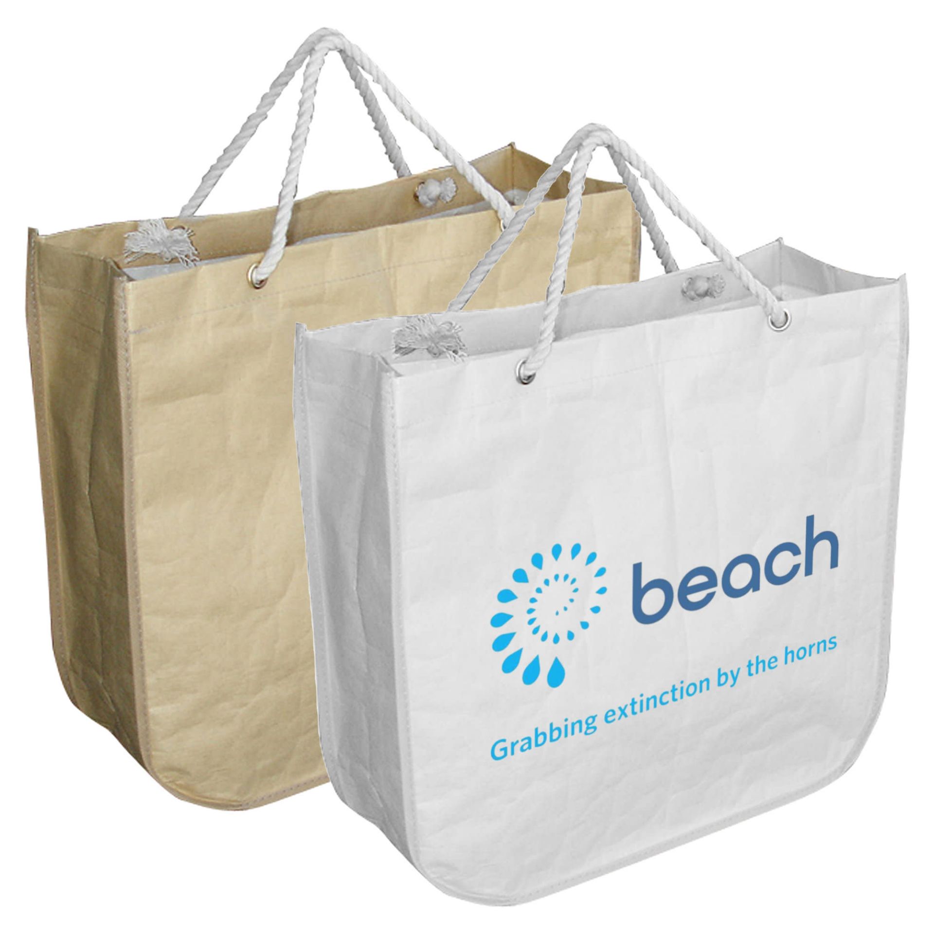 Stylish round corner paper bag with white PP woven laminated inside short cotton rope handles with reinforced metal eyelets to add more strength large gusset with a small pouch inside. Water resistant tough and strong. A great fashion bag branded with your logo for your promotional event.