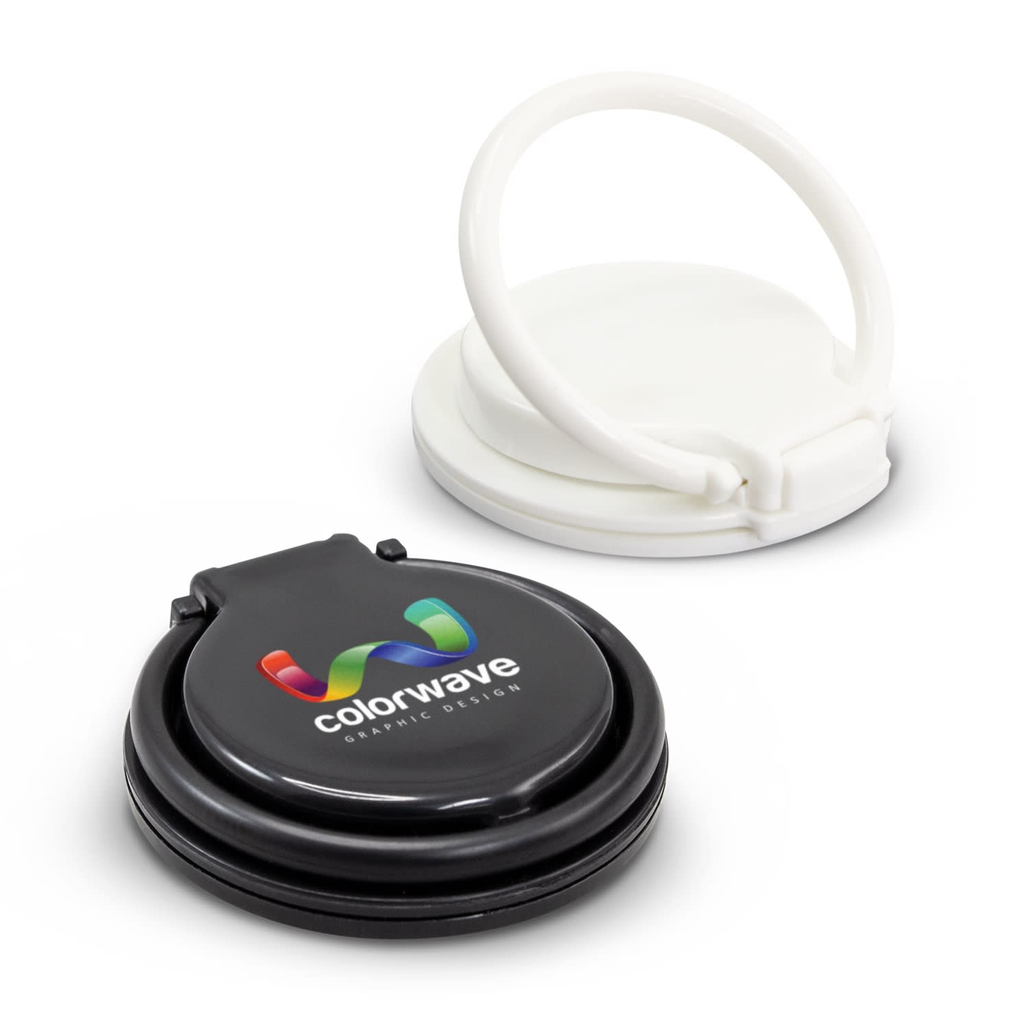 Low profile plastic phone grip which adheres securely to the back of a phone or phone case. It has a ring that snaps out to provide a secure finger grip or a handy phone stand.