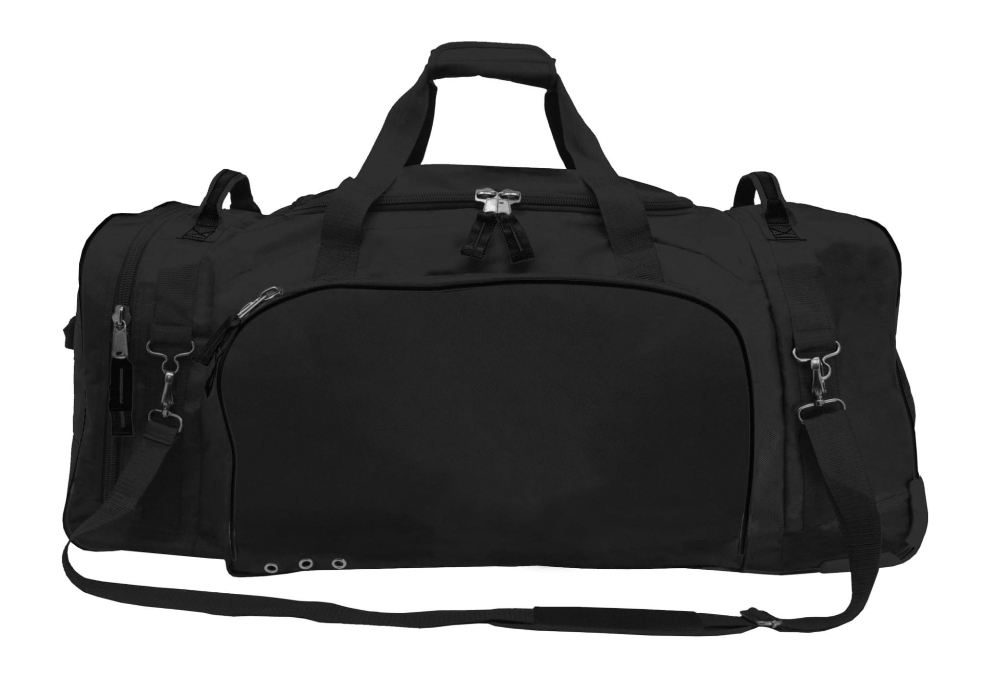 Large centre compartment with U-shaped opening, One large zippered wet pocket at the left, Front large zippered pocket with metal eyelets, One small zippered pocket at the front, Internal retractable trolley system, Additional handle on both sides for easy carry, Removable, adjustable shoulder strap and carry handle, Studded base for durablility
