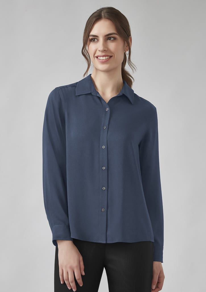 Features: Easy fit button down long sleeve shirt, designed to be relaxed through the body 2 Modesty bust buttons Button sleeve cuffs - can be rolled up for 3/4 look Curved hemline, with longer back hem; Short sleeve and long sleeve blouse styles also available Mineral Blue coordinates with Biz Collection Memphis shirting range and City Polo range Fabric: 100% Recycled Polyester Sizes: 6 - 26