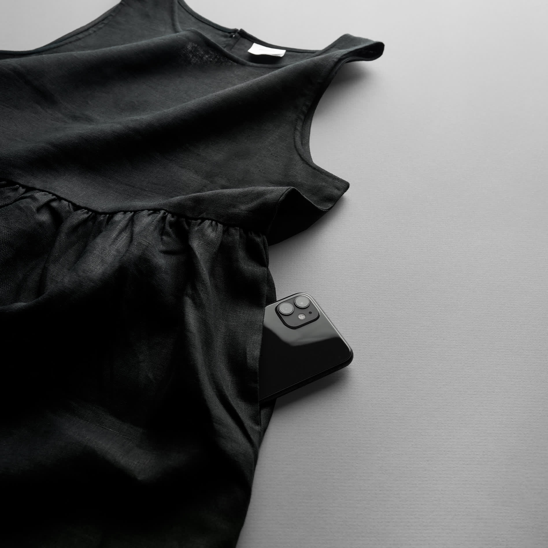 Mid length, sleeveless, back neck button fastening, concealed bindings, gathered at waist seam, side seam pockets